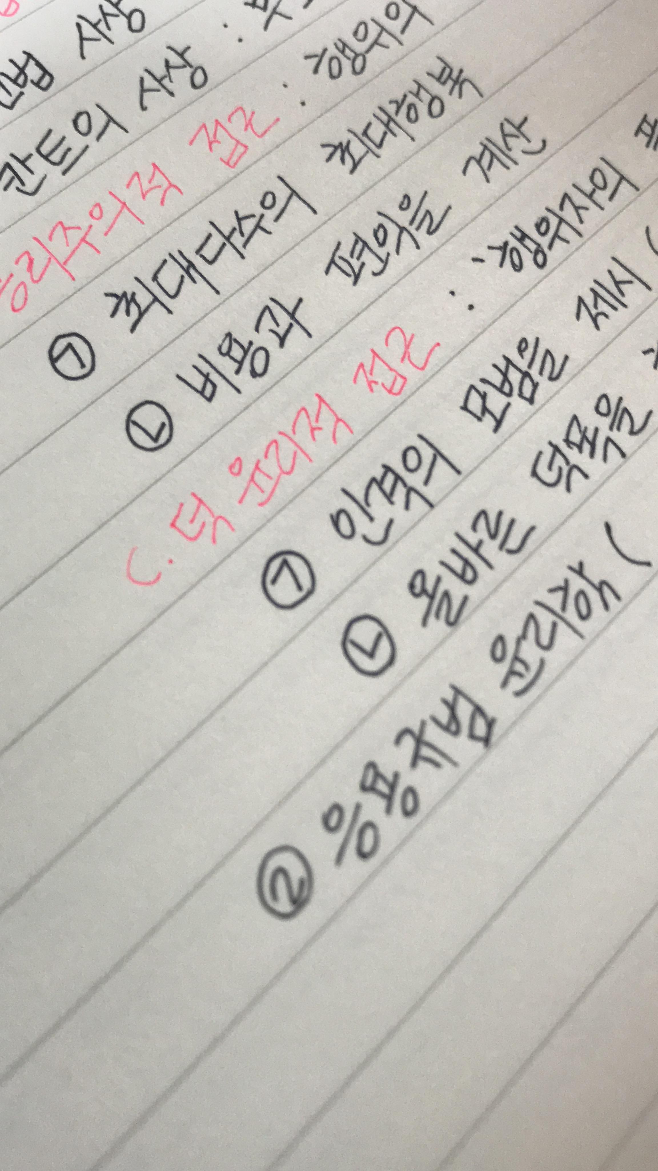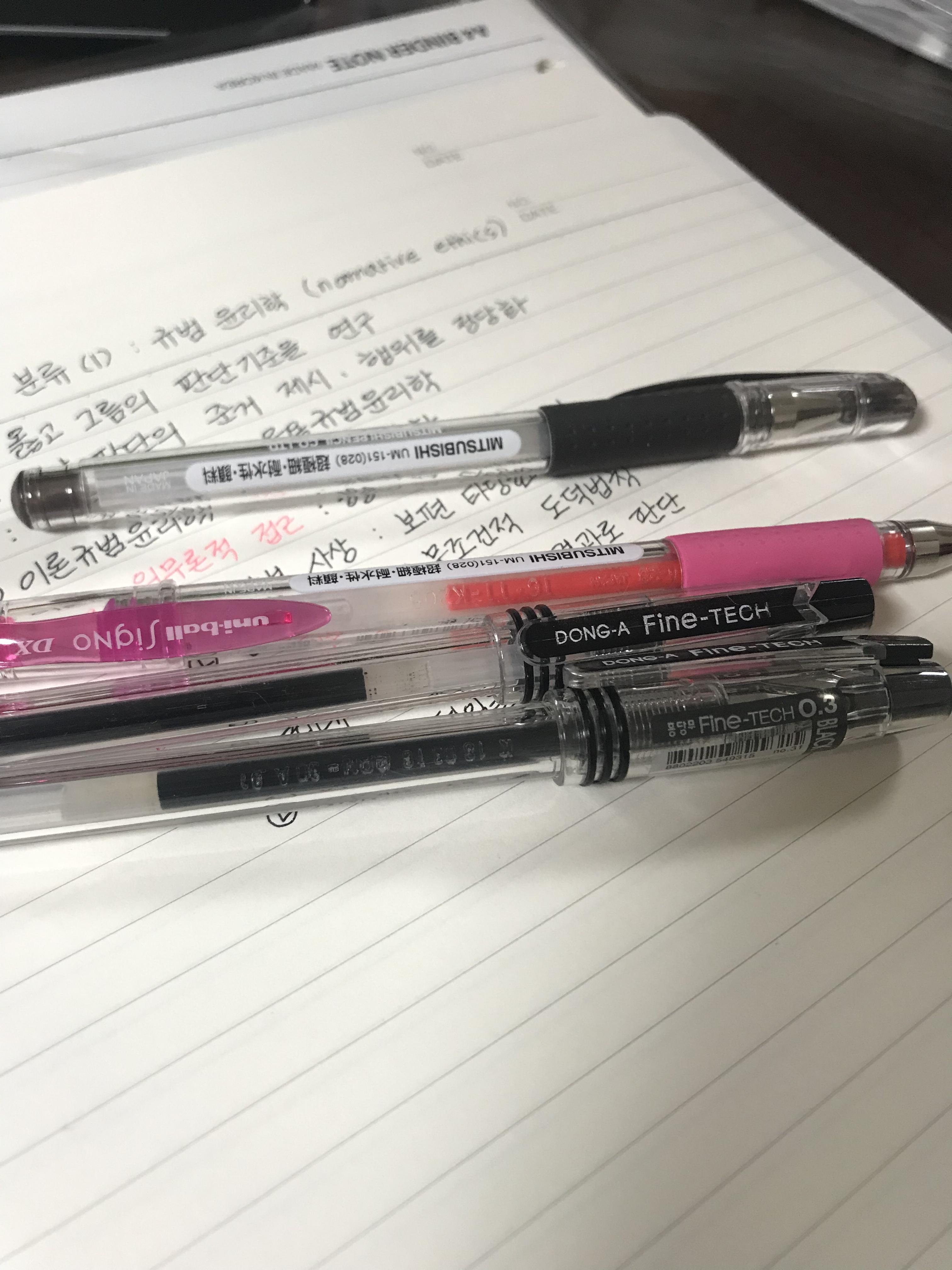 시그노(분홍)와 동아 파인테크(검정)을 사용해서 필기했다. 필기 결과만 놓고 보면 아주 양호함. 사용감은 시그노가 조금 더 낫지만 파인테크도 쓸만하다. 게다가 가격도 싸고, 내구성도 뛰어나서 대체품으로 아주 괜찮음.